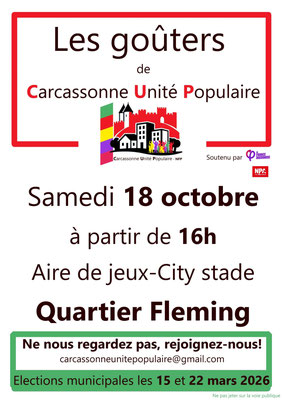 Municipales 2026. Les goûters de Carcassonne Unité Populaire. Ne nous regardez pas, rejoignez nous.